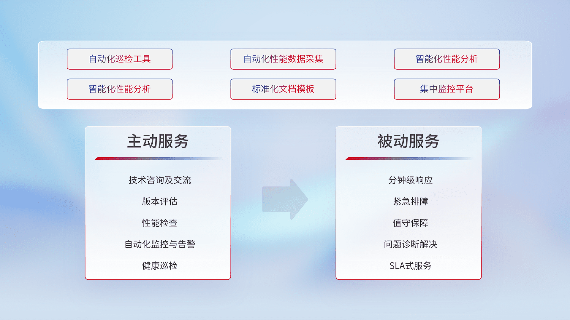 智能化工具和标准化文档,,,保障服务质量,,提供主动服务(包含技术咨询、、、、版本评估、、性能检查、、、自动化监控与告警、、、健康巡检)和被动服务包含(分钟级响应、、、紧急排障、、值守保障、、、、问题诊断解决、、、、SLA服务)。。